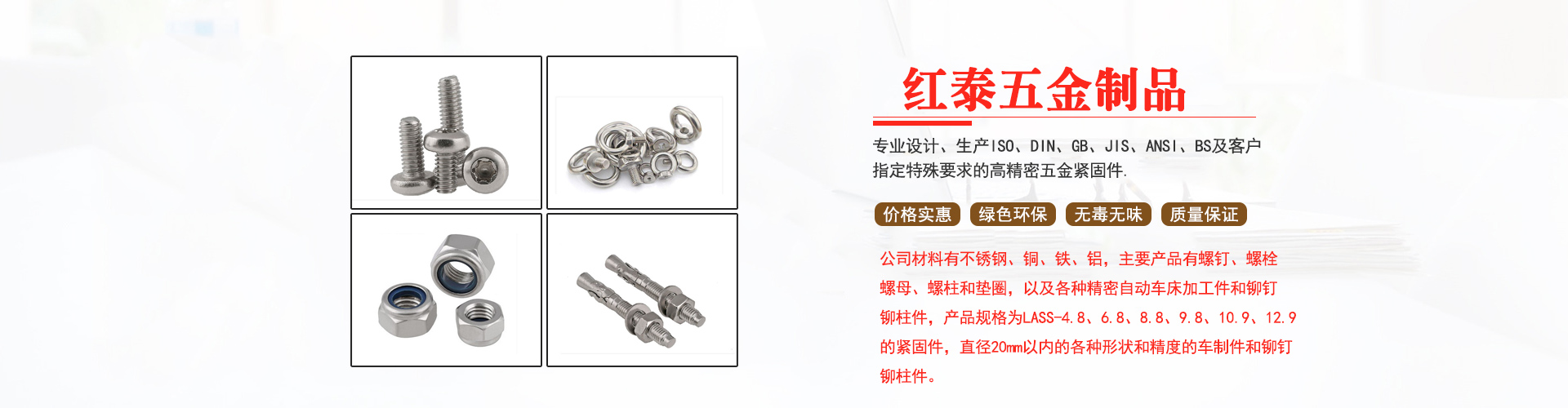 東莞市紅泰五金制品有限公司,公司占地六千多平方米,擁有五十多組螺絲機(jī)及六十臺自動車床設(shè)備。是一家專業(yè)設(shè)計(jì)、生產(chǎn)ISO、DIN、GB、JIS、ANSI、BS及客戶指定特殊要求的高精密五金緊固件的制造企業(yè)。